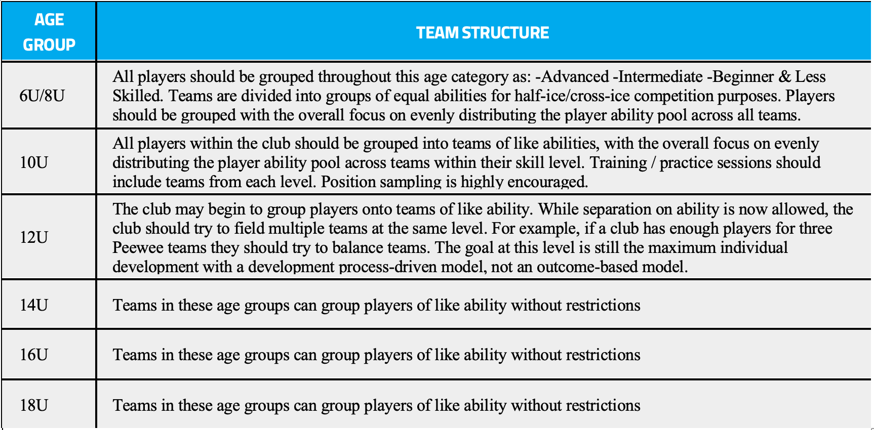 Links below to PDF's with specifics at each age level covering things like USA Hockey objectives and focus, tactical skills, physical & psychological development, training and competitive environment, coaching considerations, and more.